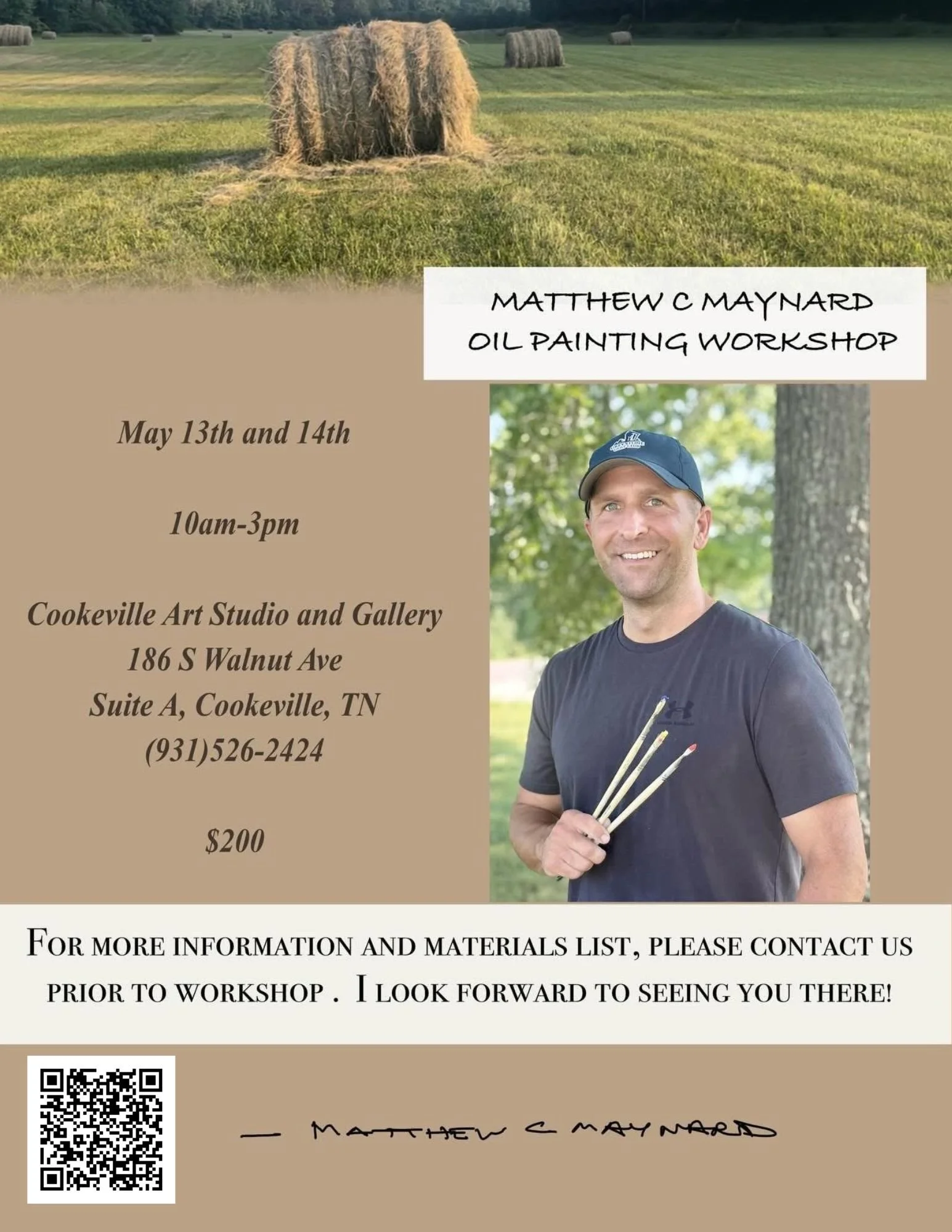 Matthew C Maynard is bringing his oil painting workshop to Cookeville Art Studio and Gallery on May 13 and 14 from 10am to 3pm. Whether you’re looking to refine your skills or try something new, this is a hands on opportunity to learn directly from a working artist.